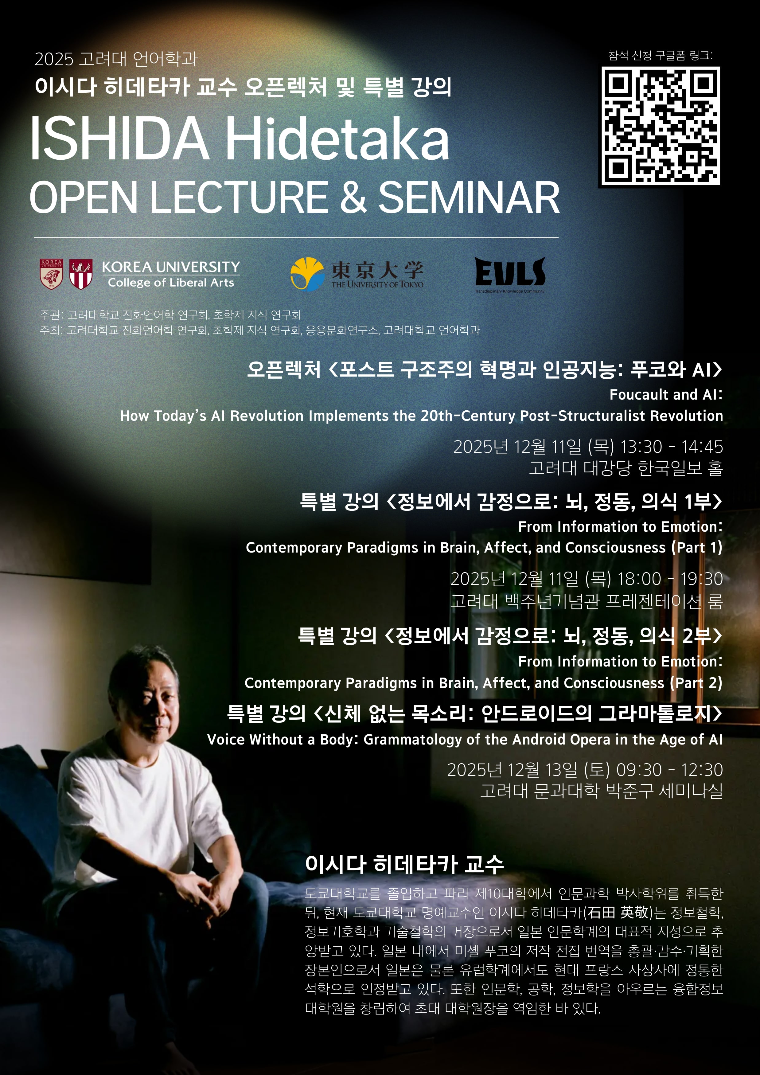 고려대학교 진화언어학 연구회는 도쿄대학교 명예교수이자 정보철학, 정보기호학과 기술철학의 거장 이시다 히데타카(Hidetaka Ishida) 교수를 초청하여, 2025년 12월 11일 (목)과 13일 (토) 오픈렉처와 특별 강의를 개최합니다.